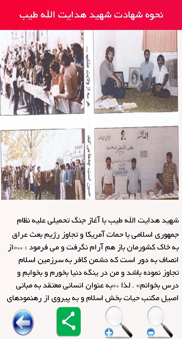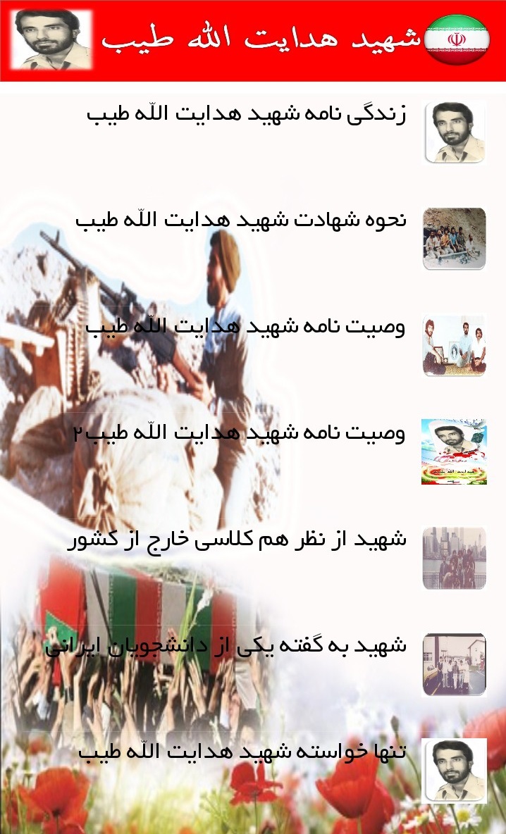 با درود خدمت هم تباران عزیز و علاقمندان به فداییان میهن معرفی و دانلود نرم افزار جامع آندروید شهید بزرگ، مهندس هدایت الله طیّب تهیه شده توسط جناب آقای مصطفی گلستانی فر فعال رسانه ای و عضو قرارگاه دنشجویی شهید طیّب استان کهگیلویه و بویر احمد روی لینک زیر کلیک کنید: لطفاً پس از نصب نرم افزار، به این برنامه در بازار امتیاز پنج ستاره را بدهید تا این برنامه ارتقا یافته و در دسترس دیگران نیز قرار بگیرد تصاویری از نمای نرم افزار: