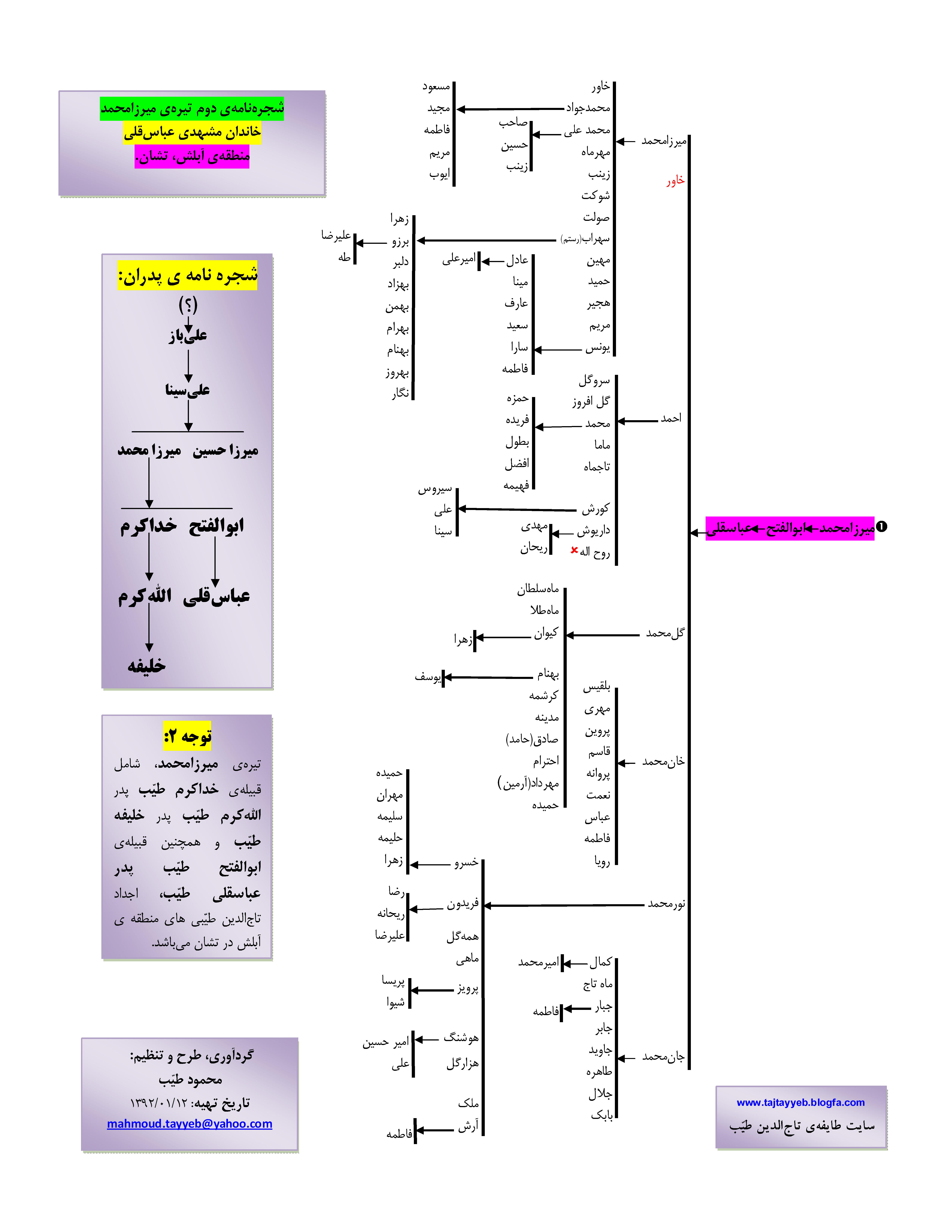 (تولد: ؟ ـ درگذشت: اردیبهشت 1349)، شهر تشان (شجرهنامۀ اول تیرۀ میرزامحمد طیّب) شهر تشان، کوی آبلش(دِهِ عباسقلی ) به روز شده تا آخرین تولدها در پایان سال 1395 لینک دانلود در اندازۀ اصلی نیز قرارداده شده.