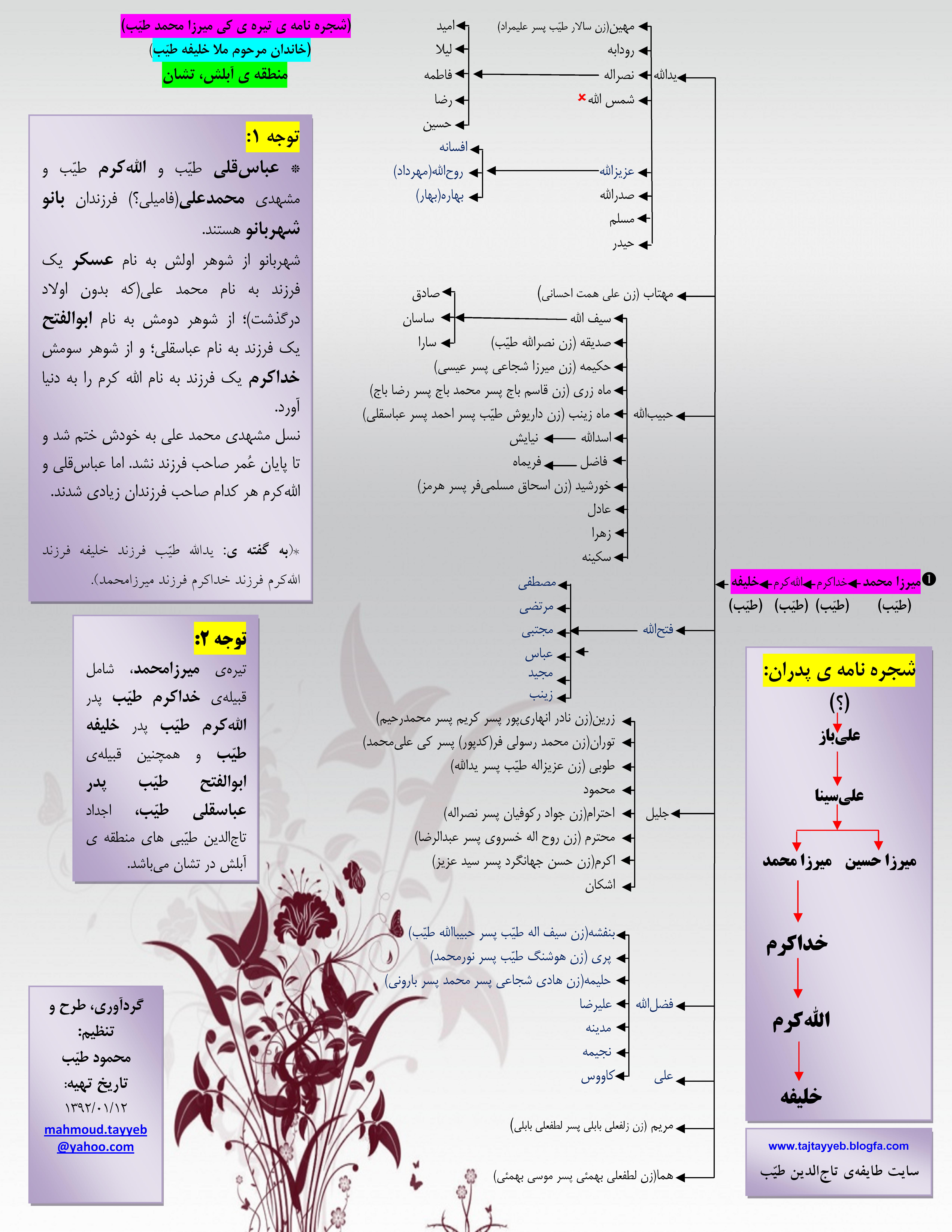 (تولد:1279 ـ درگذشت: 14/04/1365)، شهر تشان (شجرهنامۀ دوم تیرۀ [کی]میرزامحمد طیّب) شهر تشان، کوی آبلش(دِهِ عباسقلی) به روز شده تا آخرین تولدها در پایان سال 1395 لینک دانلود در اندازۀ اصلی نیز قرارداده شده.